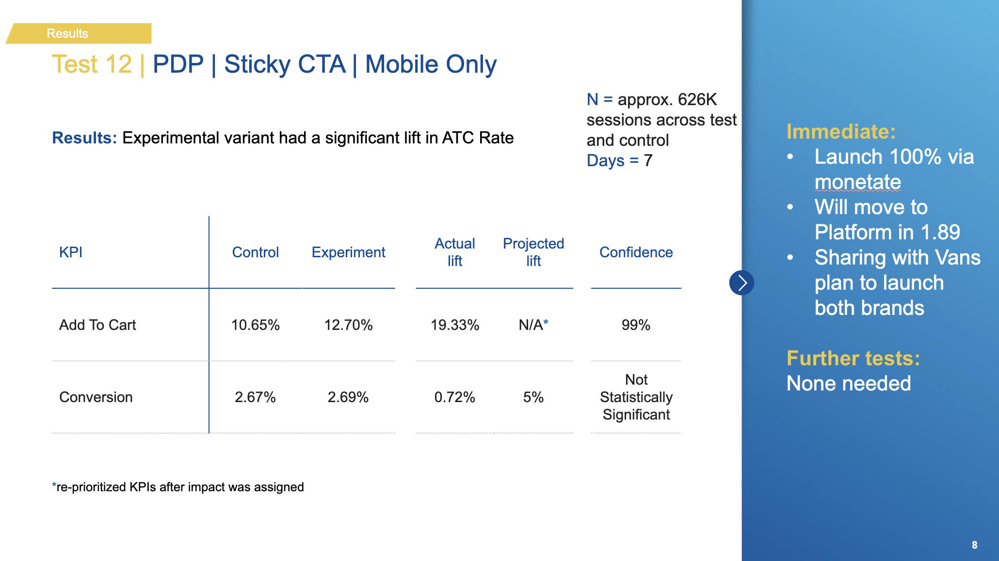 The ready-for-review designs were presented to both brands, and the best ones were chosen for A/B testing. After running the tests for at least two weeks, we gathered the results. (See the screens with designs and outcomes below.)