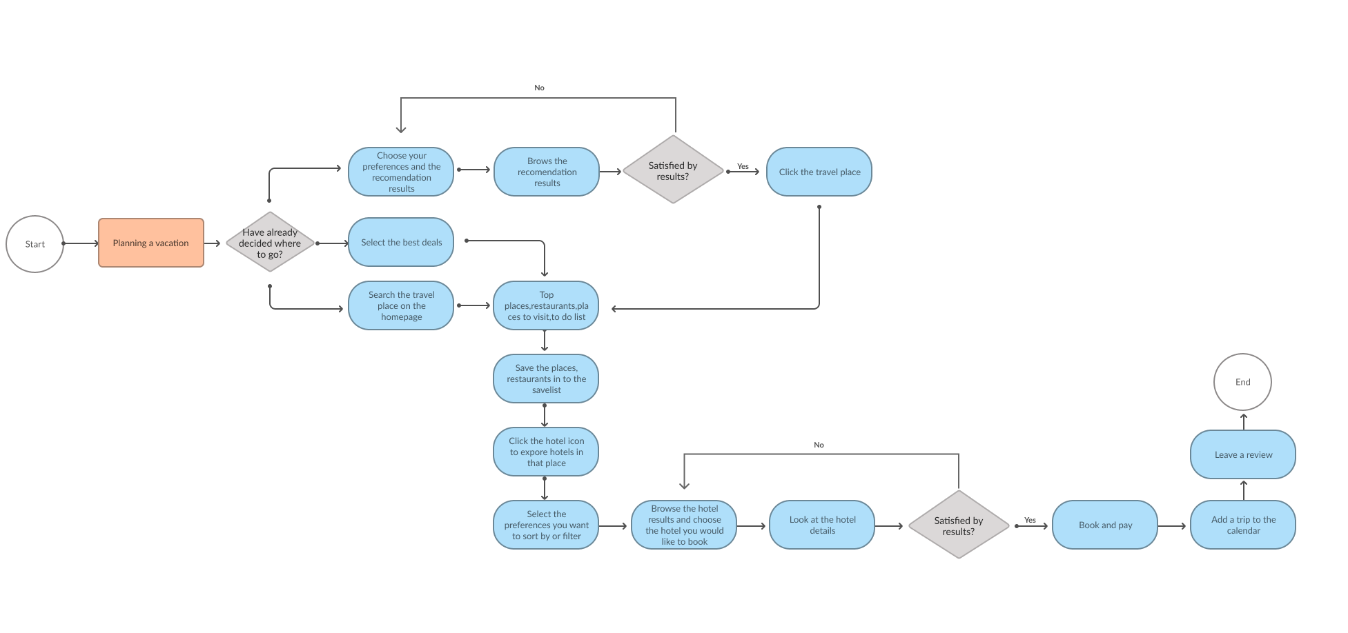 By summarizing the findings from user interviews and competitive analysis, I revised the trip-planning stages of the journey map and mapped out the flowchart of my app.